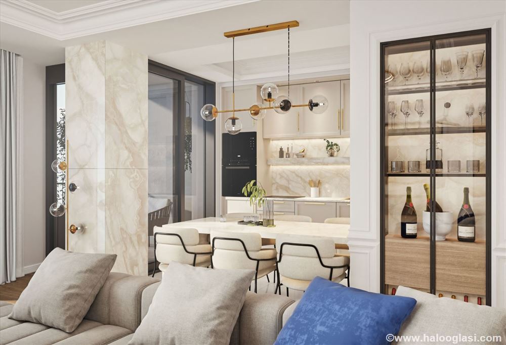 The apartment consists of a spacious living room, a kitchen with a dining area, two bedrooms, a terrace, and a bathroom. Premium materials and high-end fixtures have been used throughout.